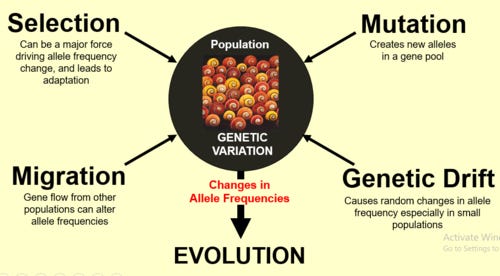Migration is one of four important factors of evolution. Migration introduces uncommon or rare gene variants into the geographical gene pools available for potential reproduction. Mating human pairs meet, and if they have children, their genetic possibilities are passed along. Humans migrate. When they migrate and pair with people who live where they’ve moved to, they pass their genetic possibility along. The actual genetic content of the entire population is affected on a large scale by migrations and reproductions that add up over time.