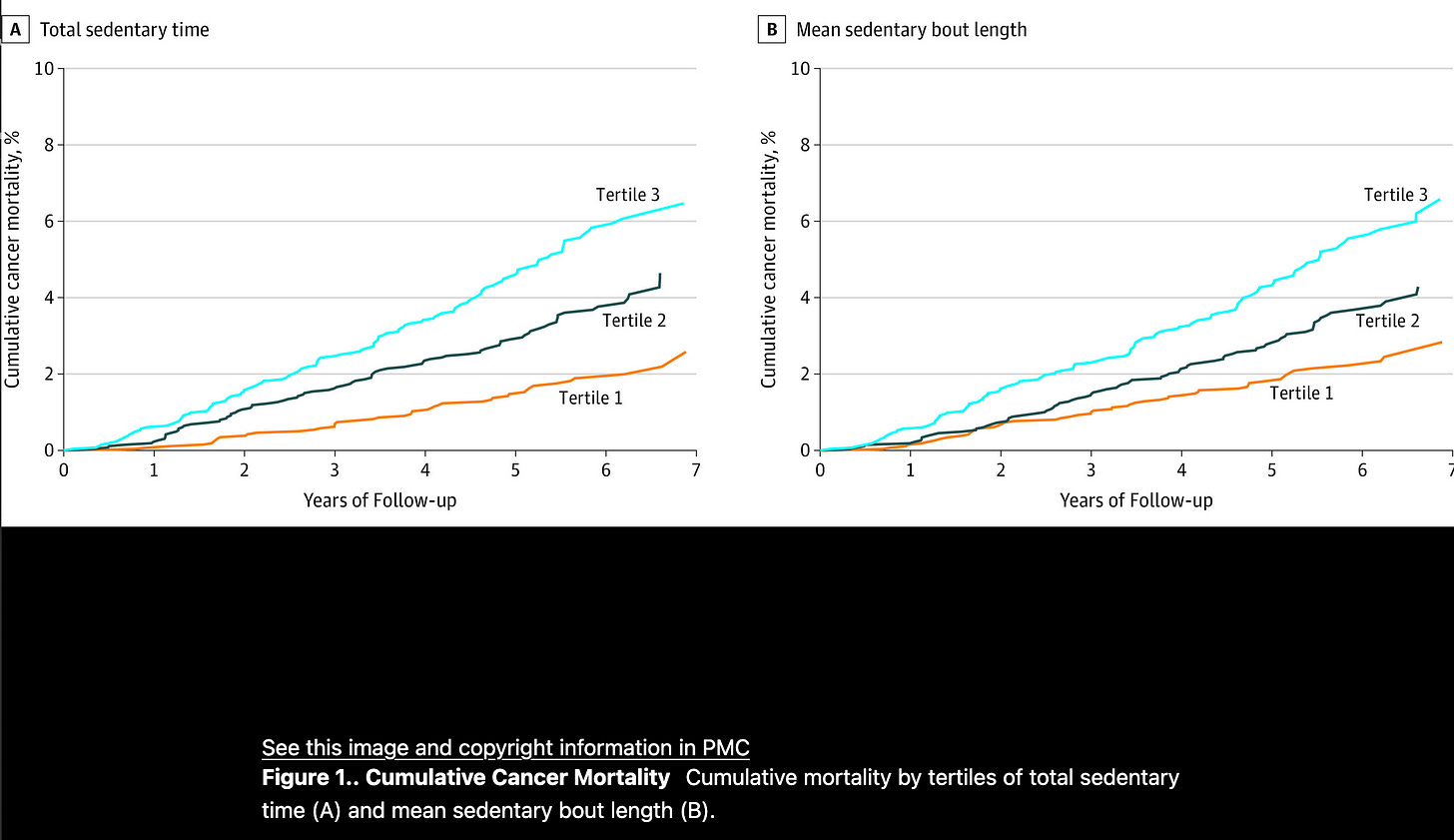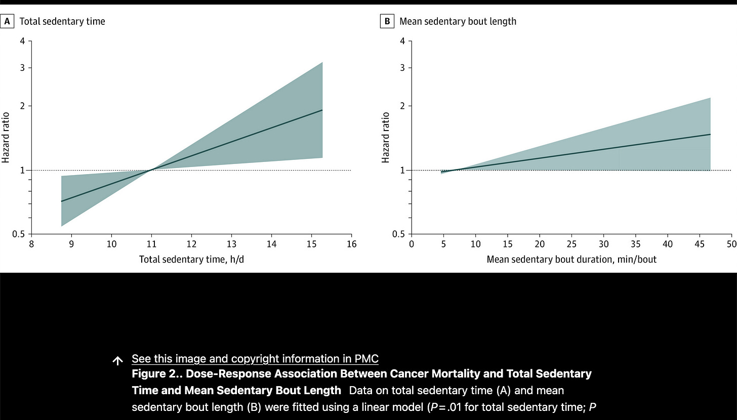 Leah showed me the below graphs from the 2020 study. These show that it’s better for our health and chances of not getting cancer to only have about 11 hours of sedentary time per day on average. That includes sleep. So if you slept 8hrs per night, you would only have 3 total hours of sedentary time left.